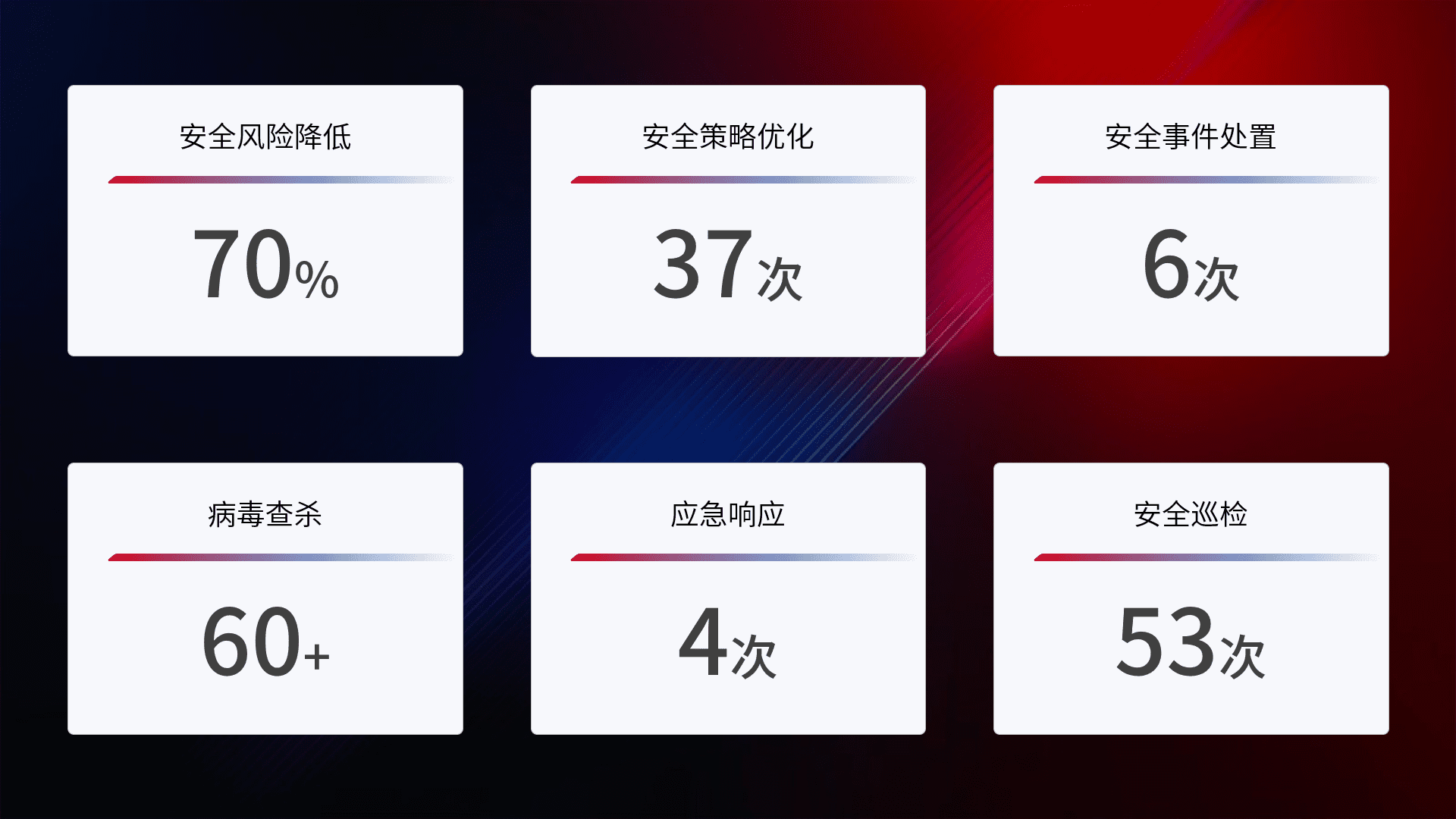 提供全面的安全事件报告体系,,,包括处置报告、、周报、、、、季度和年度总结,,结合持续监控,,,,帮助客户深入了解网络安全状况。。。。